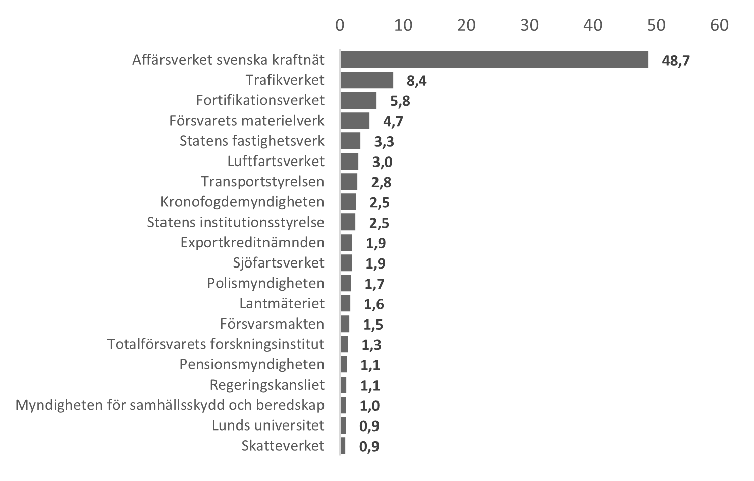 De flesta myndigheter tar alltså ut avgifter men det är ett fåtal som står för en stor del av intäkterna. Det är tre myndigheter som står för mer än hälften av intäkterna. Svenska kraftnät var den myndighet som hade högst avgiftsintäkter 2023 följt av Trafikverket och Fortifikationsverket