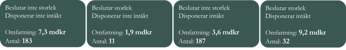 Vår undersökning visar att det finns 32 avgiftsbelagda verksamheter som avviker från regeln om att myndigheterna inte både ska besluta om storleken på avgiften och disponera intäkten. Intäkterna för dessa 32 avgiftsbelagda verksamheterna var 9,2 miljarder kronor 2023.