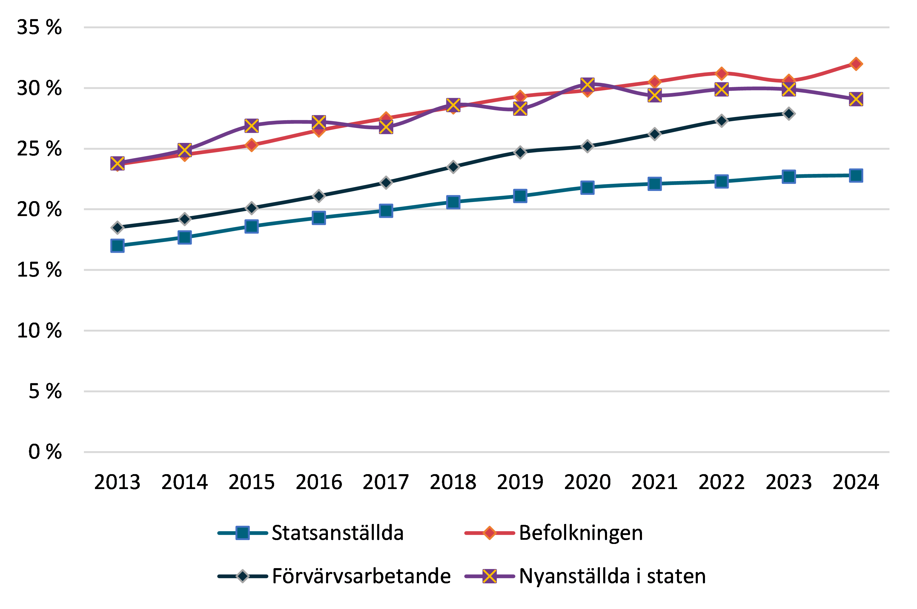 Men andelen anställda i myndigheter under regeringen som har utländsk bakgrund har inte ökat i samma takt som andelen med utländsk bakgrund i befolkningen, eller bland förvärvsarbetande över lag. Skillnaderna har tvärtom ökat under flera år. År 2013 skiljde det 6,7 procentenheter mellan andelen anställda i myndigheter under regeringen som har utländsk bakgrund och andelen med utländsk bakgrund i befolkningen. År 2024 hade skillnaden ökat till 9,2 procentenheter. Enbart mellan 2023 och 2024 har skillnaden ökat med 1,3 procentenheter.