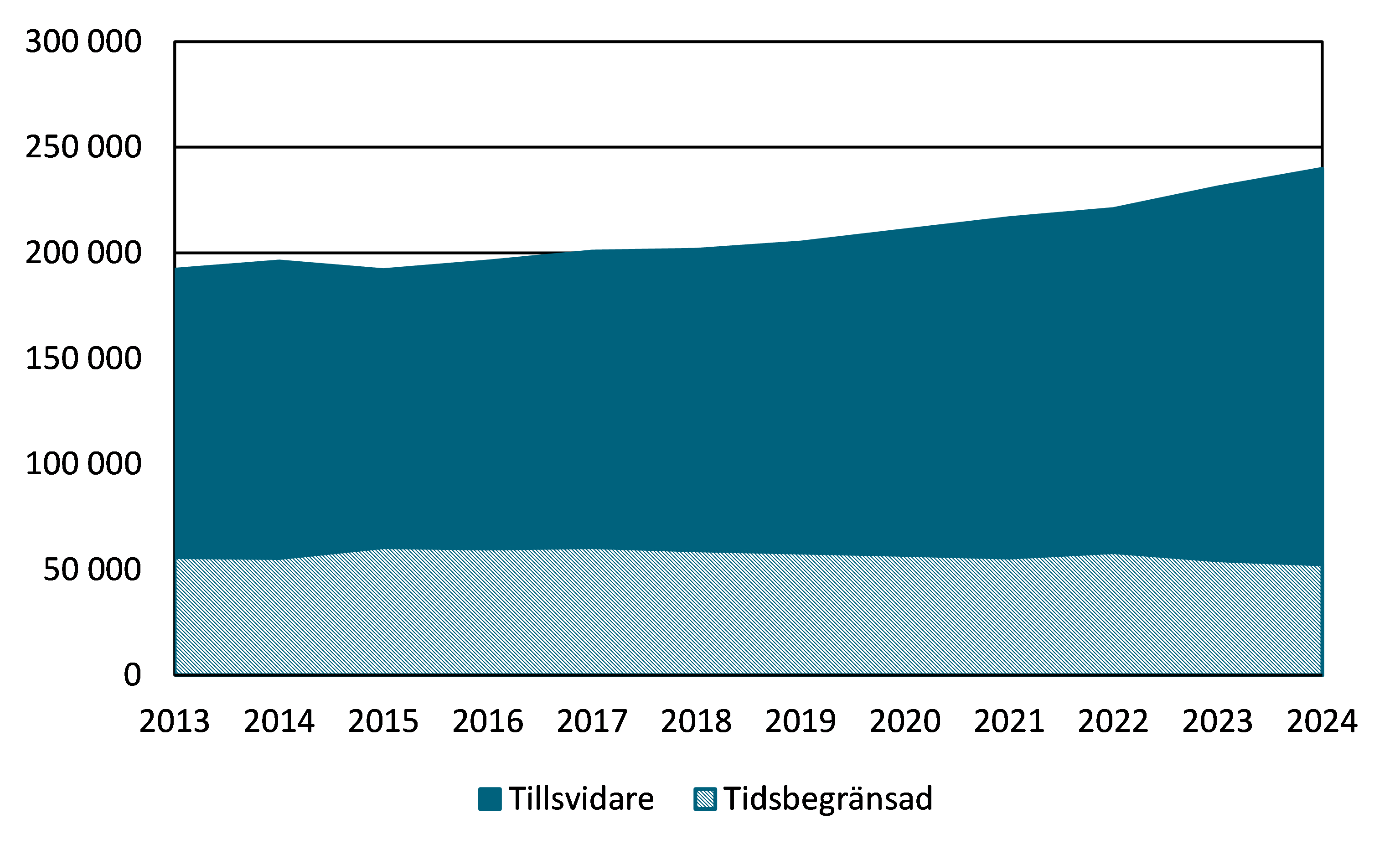Antal tillsvidareanställda och antal med tidsbegränsad anställning i myndigheterna under regeringen, 2013–2024. Källa: Arbetsgivarverket.