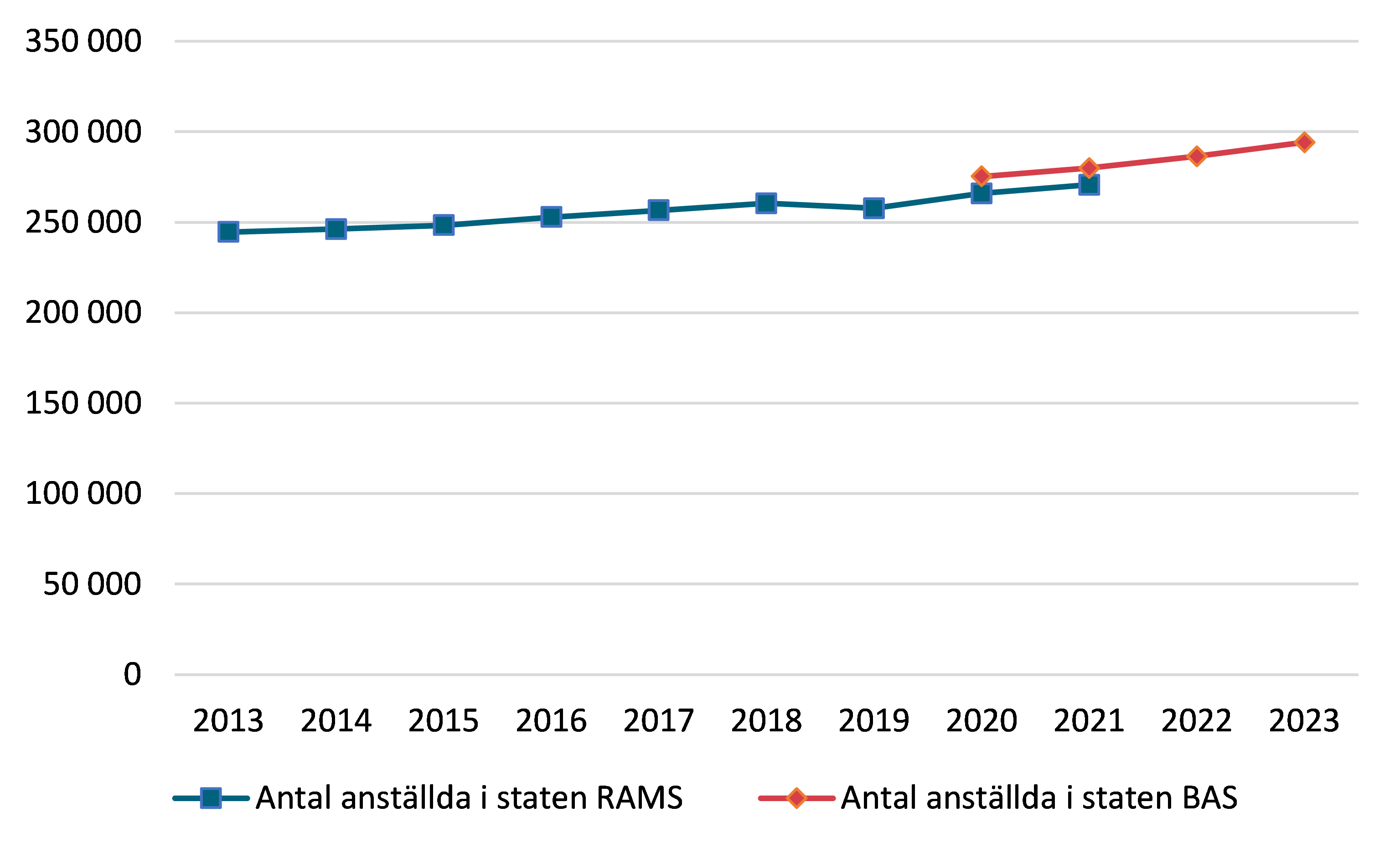 Antal anställda i staten 2013–2023. Kommentar: SCB har ersatt den registerbaserade arbetsmarknadsstatistiken (RAMS) med statistikprodukten Befolkningens arbetsmarknadsstatus (BAS). I RAMS finns statistik fram till och med 2021. Statistiken som bygger på BAS finns framställd med 2020 och 2022 som första respektive senaste referensår. De årliga uppgifterna om antalet sysselsatta i staten och övriga sektorer är högre i BAS jämfört med RAMS. För mer information, se SCB (2023). Skillnader mellan RAMS och BAS årsregister. Källa: SCB, Registerbaserad arbetsmarknadsstatistik (RAMS) och Befolkningens arbetsmarknadsstatus (BAS).