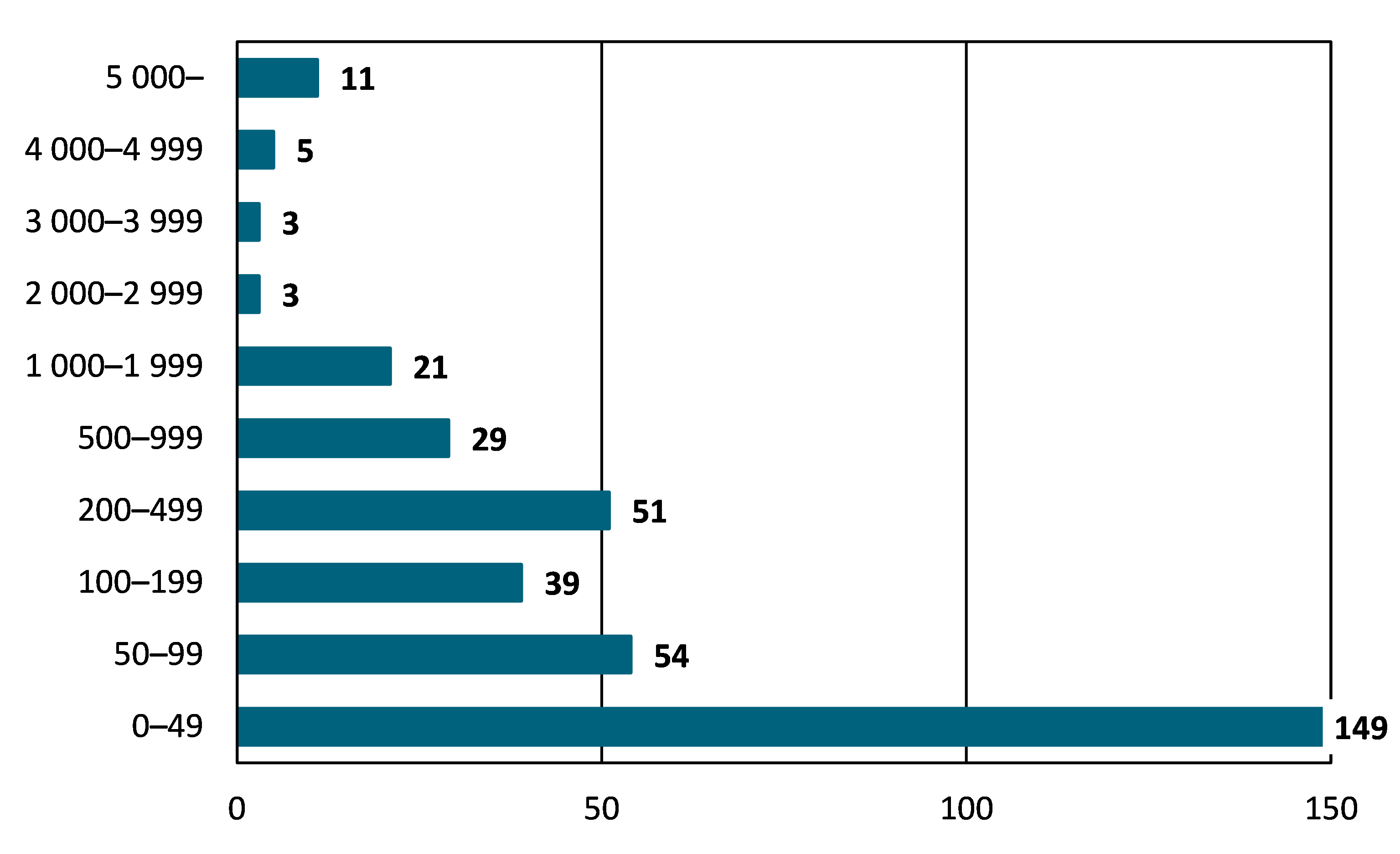 Antal myndigheter under regeringen indelade efter antal årsarbetskrafter, 2025. Kommentar: Vi saknar uppgifter om myndigheterna Försvarets radioanstalt (FRA) och Säkerhetspolisen (Säpo), och således ingår inte de två myndigheterna i figuren ovan. Källa: SCB, Domstolsverket, myndigheternas årsredovisningar, mejluppgifter från myndigheter samt Statskontorets egna beräkningar.